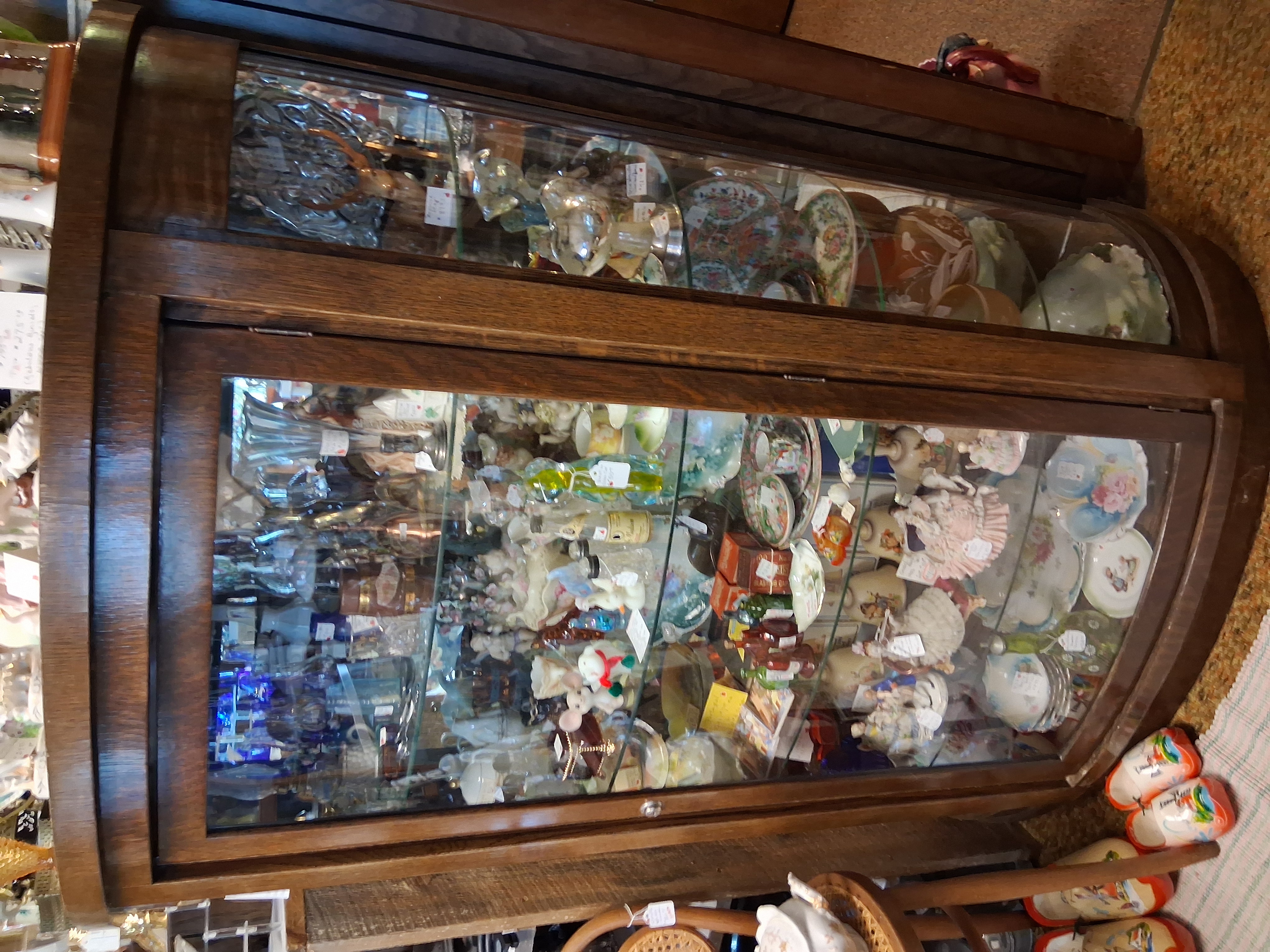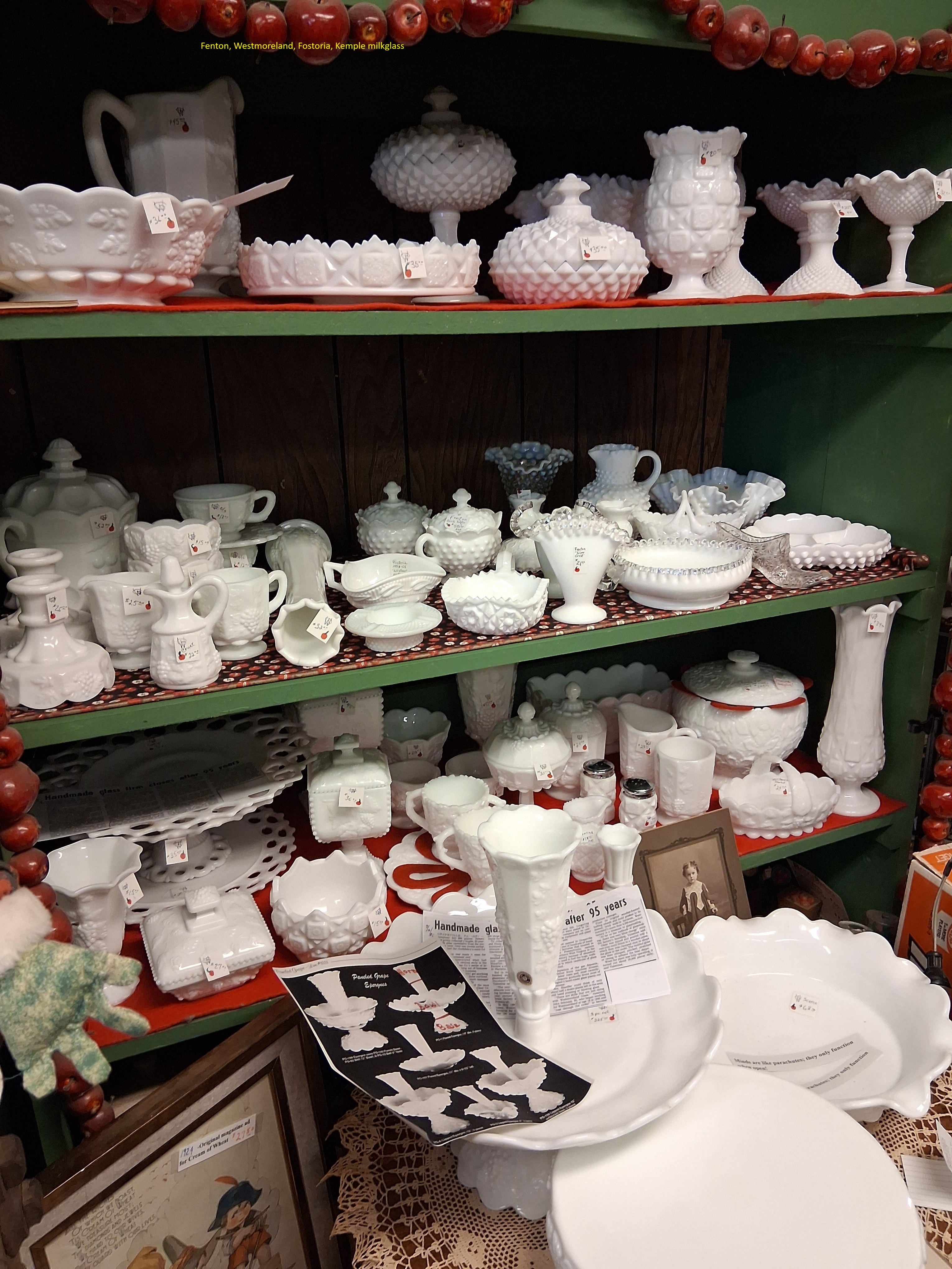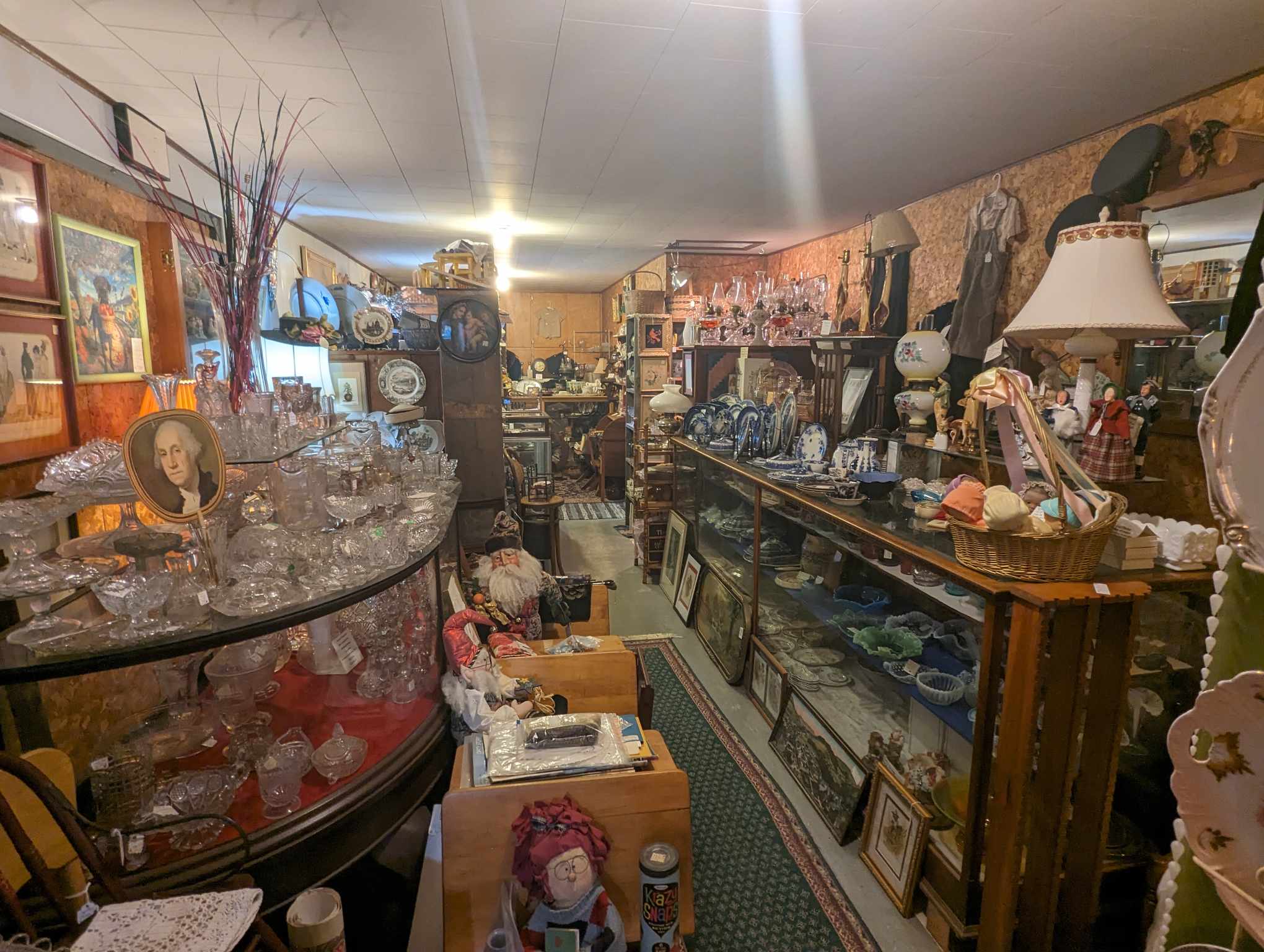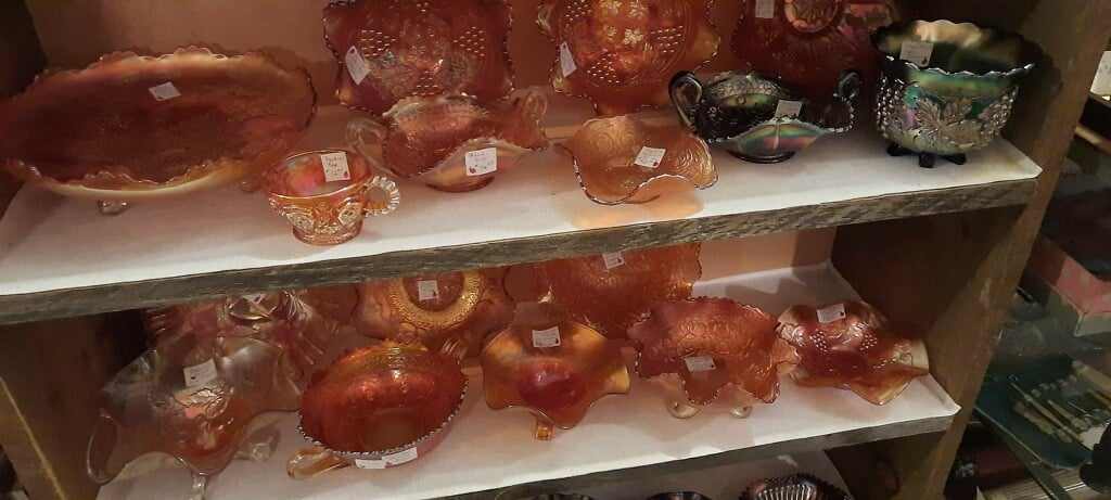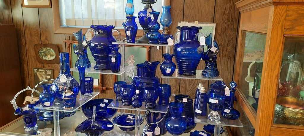 Large selection of glassware, pottery, furniture and collectibles. Toys, tools, advertising, sports memorabilia, quilts, linens, breweriana, copperware, kitchenware, oil lamps, electric lamps.