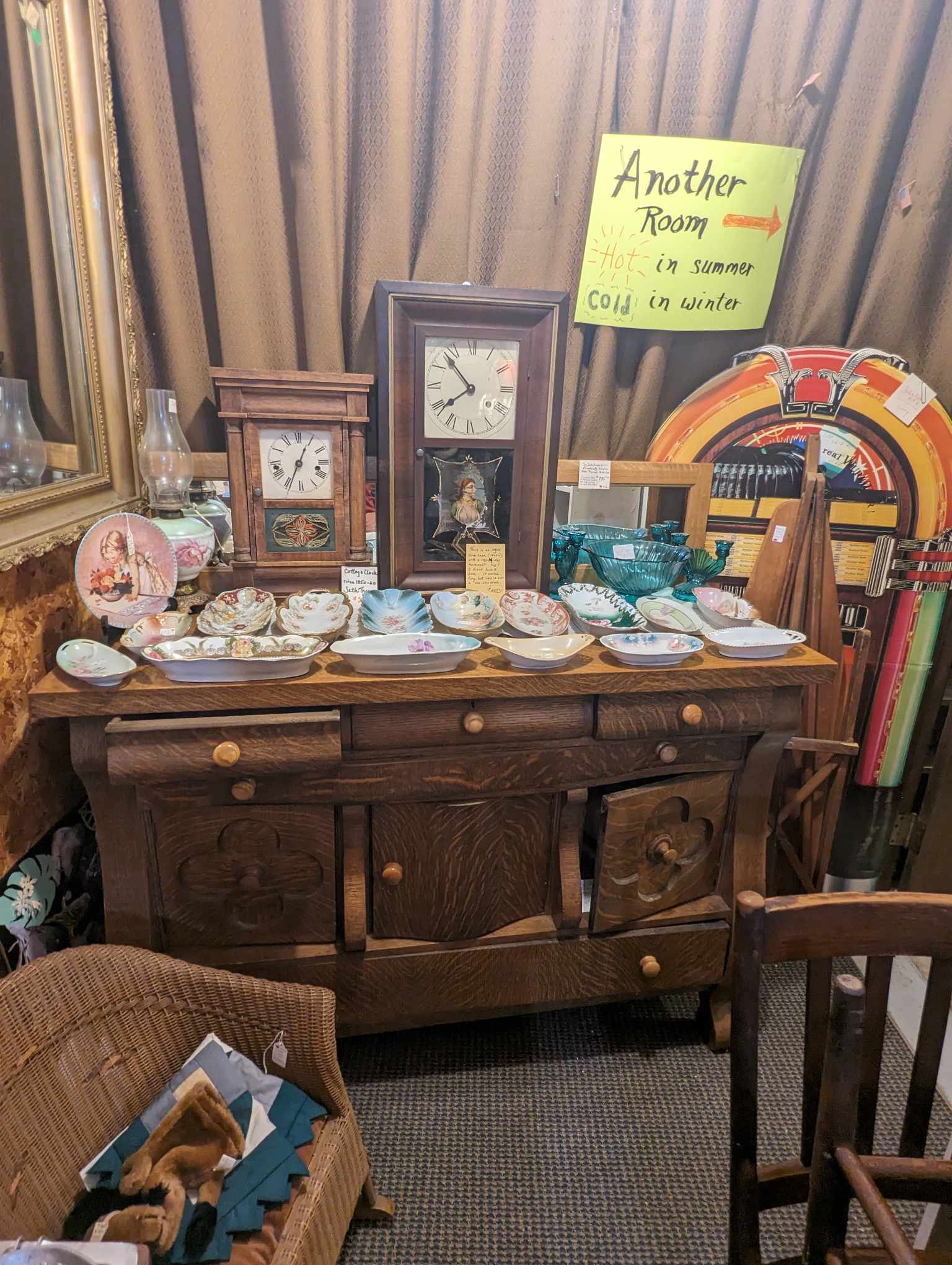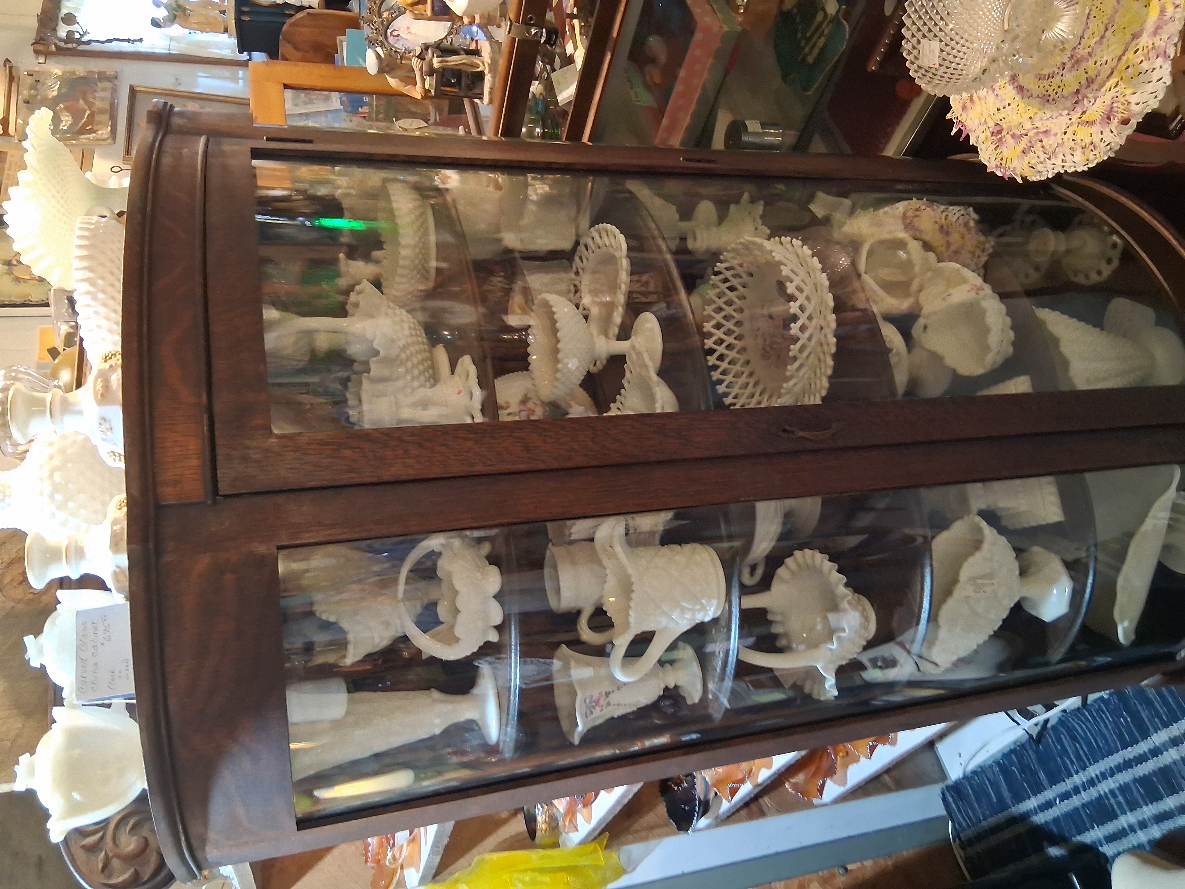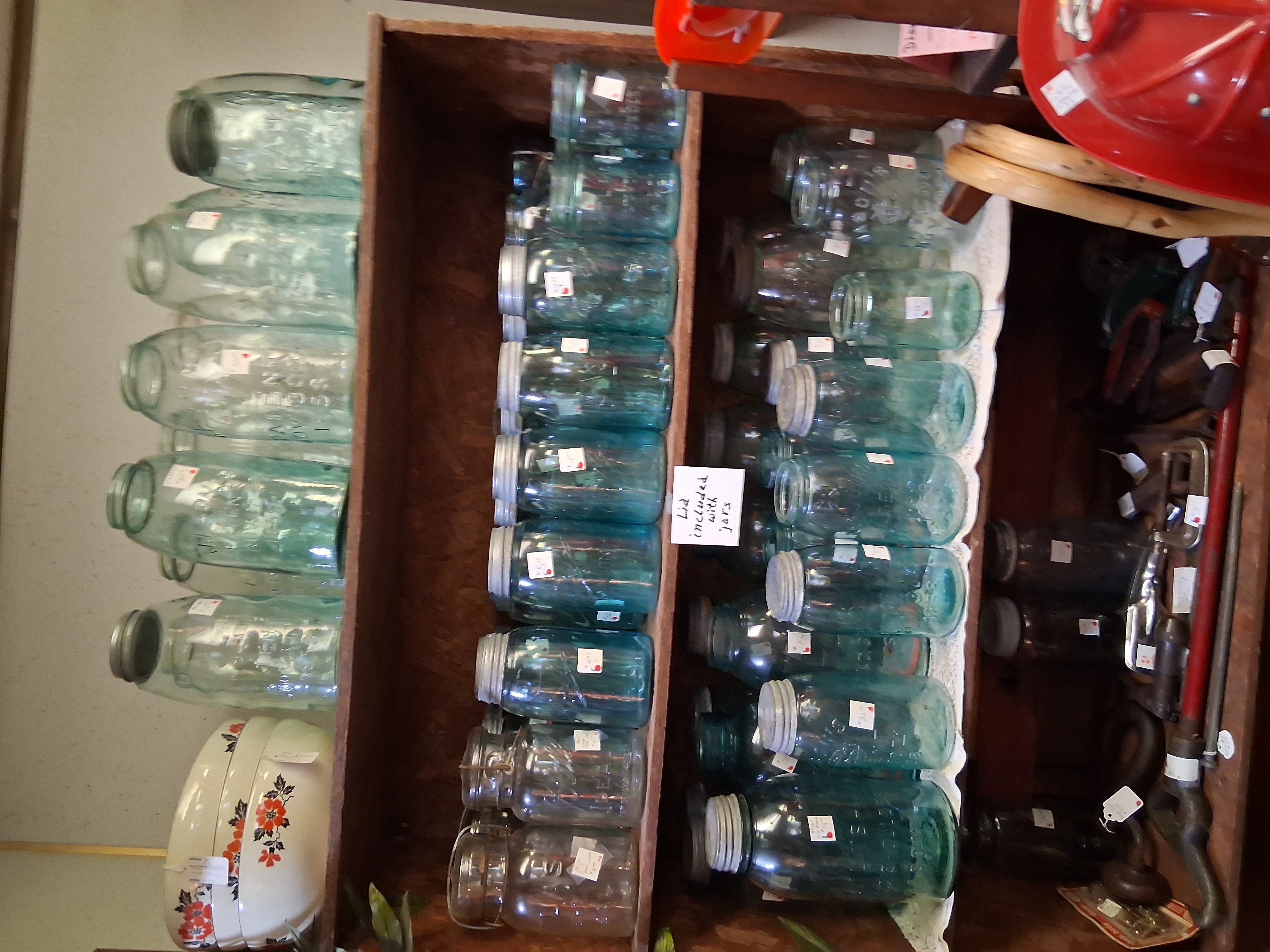 Large selection of glassware, pottery, furniture and collectibles. Toys, tools, advertising, sports memorabilia, quilts, linens, breweriana, copperware, kitchenware, oil lamps, electric lamps.